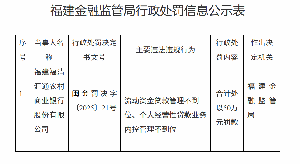 11月26日点点盈,福建金融监管局行政处罚信息公示表显示,福建福清汇通农村商业银行股份有限公司因流动资金贷款管理不到位、个人经营性贷款业务内控管理不到位被合计处以50万元罚款。