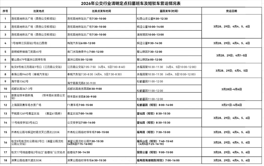 除短驳服务外,今年还将开通3条扫墓专线,分别从海宁路晋元路、恒丰路长安路(上海火车站南广场)以及成都北路南京西路站(并线沪嘉专线)发往松鹤墓区。专线运营时间为3月21日、22日及3月28日至4月6日,实行客满即发的灵活班次,确保市民出行便捷。
